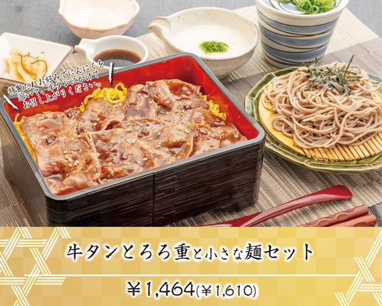 特製タレを絡めたやわらか仕立ての牛タンを焼き上げ、豪快にお重にしました。別添えのとろろは味変に牛タンにかけてお召し上がりください。小さな麺とのセットが嬉しい、「牛タンとろろ重セット」をぜひこの機会にご賞味ください。