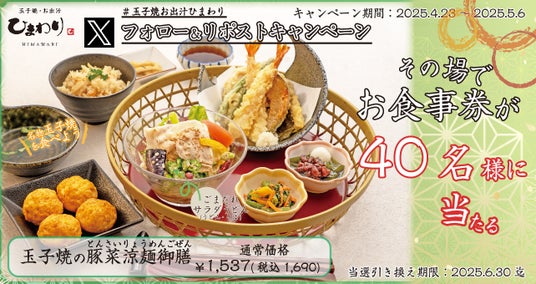あわせて、公式Xアカウントとフォロー&リポストして応募すると、抽選で40名様に「玉子焼の豚菜涼麺御膳1人前(税込み1,690円)」をお召し上がりいただけるデジタルお食事券プレゼントキャンペーンを2025年4月23日(水)を開催中です。この機会にぜひご応募ください。