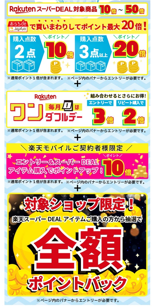 楽天スーパーDEAL対象商品のご購入で、最大81倍のポイントを獲得、さらに抽選で全額ポイントバックの特典など、大変お得なキャンペーンになります。