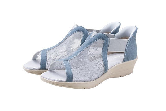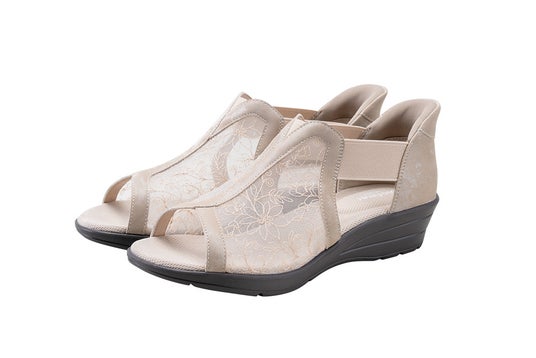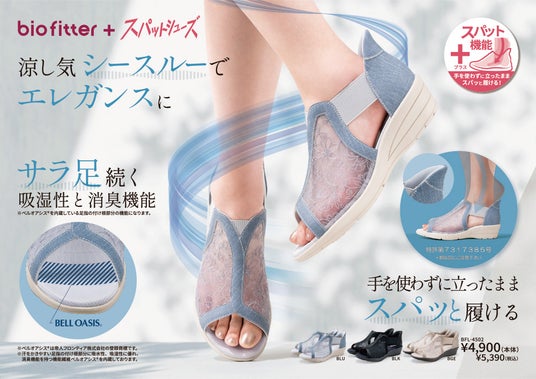 この度、新発売となったバイオフィッターBFL-4502は、アッパーにエレガントな花柄のチュール素材を使用、通気性も良くこれからの暑い季節にぴったりなデザインです。ウェッジソールタイプで安定性に優れていて歩きやすく、脚のシルエットを美しく演出します。また、汗をかきやすいソールの足指部分には、吸水性・吸湿性に優れた消臭機能を持つ機能繊維「ベルオアシス(※)」を内蔵し、サラッと快適な足もとを持続します。そして現在、大ヒット中の手を使わずに立ったままスパッと履ける「スパットシューズ」の機能を搭載!かかと付サンダルでもかがまずに楽に履けるうれしい一足です。