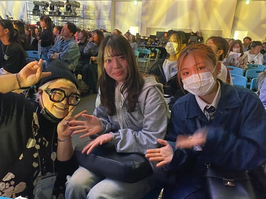 当日、会場にご招待いただいたOIF学生(右・中)と スタイリスト 相澤 樹さん(左)