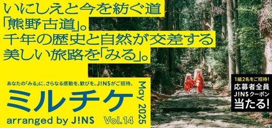株式会社ジンズ(以下JINS)は、日常では体験できない特別な「みる(見る・観る・視る)」をチケットにして毎月抽選でご招待する「ミルチケ」(https://www.jins.com/jp/campaign/miruticket/)のVol.14として、いにしえと今を紡ぐ道「熊野古道」で千年の歴史と自然が交差する美しい旅路を「みる」体験への応募受付を、2025年5月1日(木)より開始します。