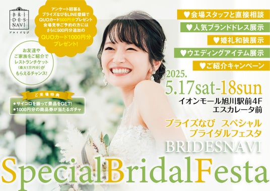 ブライズなびが出張してみなさまの結婚式のお悩み相談を解決するイベント、「ブライズなび Special Bridal Festa 2025」の開催が決定!今回は初めてのイオンモール旭川駅前店4階にて開催。さらに広くなった会場でパワーアップした内容をお届けいたします。
