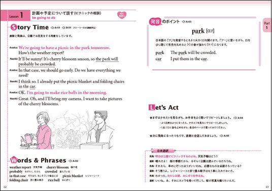 各レッスンのストーリーでは、自分の生活にありそうな場面や、自分の周りにいそうな人たちに出会うと思います。