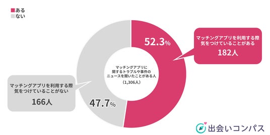 さらに、「マッチングアプリに関するトラブルや事件のニュースは、利用するかどうかに影響しない」と回答した人のうち348人にマッチングアプリを利用する際に気を付けていることはあるか質問したところ、52.3%(182人)が「ある」と回答。具体的に気を付けている内容としては以下の様なものがありました。