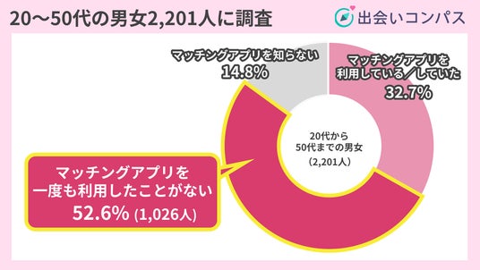 20代から50代までの男女2,201人を対象にマッチングアプリの利用経験についてたずねたところ、52.6%(1026人)が「一度も利用したことがない」と回答しました。