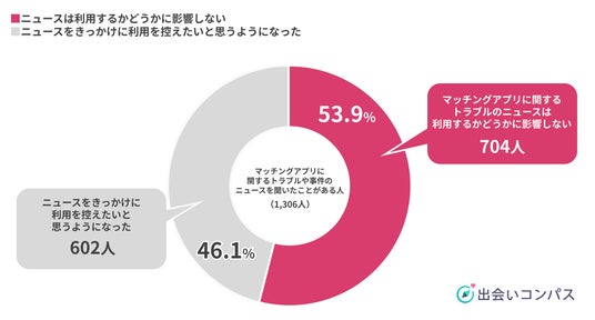 続いて、マッチングアプリに関するトラブルや事件のニュースを聞いたことがある人1306人に「アプリの利用に対する気持ちに影響を与えるか」を質問したところ、「ニュースは利用するかどうかに影響しない」と回答した人は53.9%(704人)、一方で46.1%(602人)が「ニュースをきっかけに利用を控えたいと思うようになった」と回答しました。