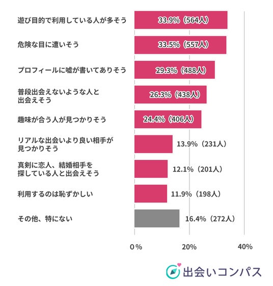 「マッチングアプリのことを知らない」と回答した人を除く1,663人を対象に、マッチングアプリの印象についてたずねると、最多回答は「遊び目的で利用している人が多そう」の33.9%(564人)、次に多かった回答は「危険な目に遭いそう」の33.5%(557人)でした。