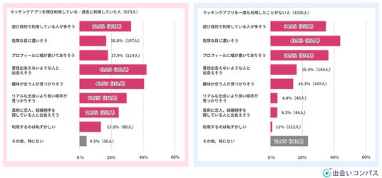 しかし、マッチングアプリを「現在利用している・過去に利用したことがある」と回答した637人のうち42.2%(269人)が「普段出会えない人と出会えそう」、40.7%(259人)が「趣味が合う人が見つかりそう」と回答しており、実際にマッチングアプリを利用した経験がある人はポジティブなイメージを持っていることが多いということもあきらかになりました。