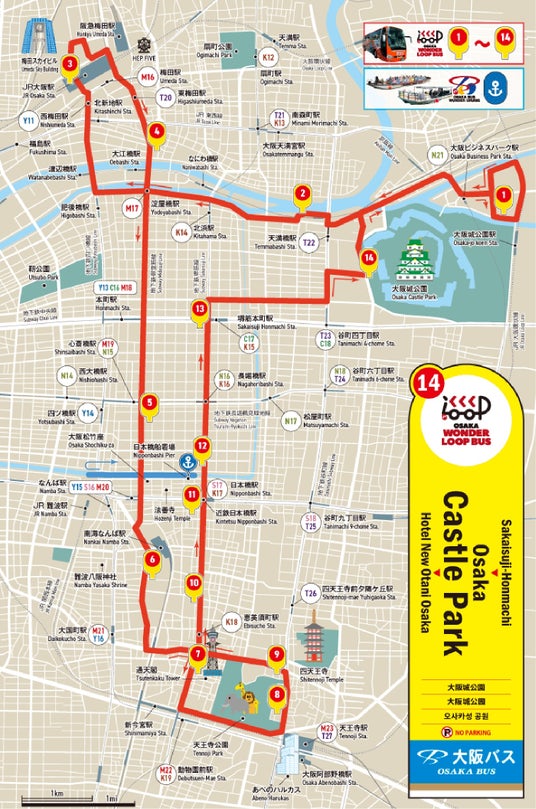 大阪市内(北は「梅田」から南は「天王寺」)に点在する14カ所の観光スポットを、乗り降り自由で快適に巡り、定番の人気スポットから、今話題の注目エリアまで、オールインワンでご案内。