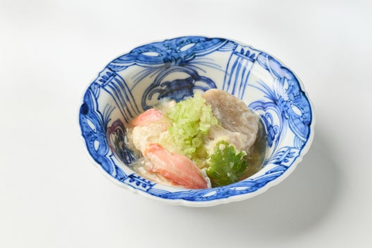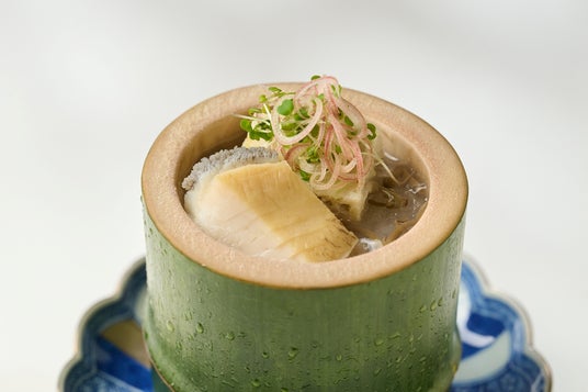 気温が高くなってくる季節に衰えがちな食欲を食欲を優しく促す、大根をすりおろしてじっくりと煮込んだスープです。葛粉を加えることで、とろみのある滑らかな舌触りに仕上げています。食感のアクセントに、ジュンサイ、鮑、蛤真丈を加え、竹筒に盛り付けることで、春夏の爽やかな季節感を表現しました。