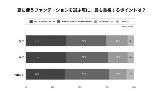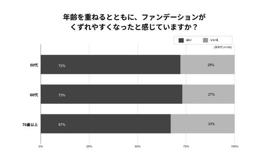 ウィルミナが行った最新の調査*¹では(https://willumina.co.jp/news/20250422-2/)、50代以上の女性が夏のファンデ-ション選びで重視するポイントとして、「紫外線ダメージをケアする機能・成分配合」していることが各年代を通じて最も高く、次いで「シミ・くすみ・シワをカバー」、「大汗でもくずれにくい」があげられました。さらに、「年齢を重ねるとともにファンデーションがくずれやすくなったと感じるか」という問いに対しては、季節を問わず、年齢肌ならではの崩れやすさを実感している方が多いことも明らかになっており、こうした実態は、リニューアルの背景ともリンクしています。