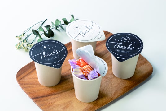小物や個包装されたお菓子などを入れた紙コップやクリアカップに本製品を乗せ、当て布を被せてアイロンを押し当てるとヒートシールできる蓋状の製品です。蓋としての機能に加えてデザイン性も高く、メッセージを書き込むこともできます。プレゼントのラッピングや、個包装のお菓子(一次包装必須)の小分けアイテムとしてご利用いただけます。