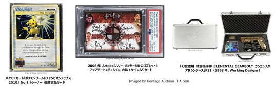 また、トレーディングカードやビデオゲーム、セル画などの貴重なポップカルチャーのコレクターズアイテムも多数展示いたします。一例として、ポケモンカード「ポケモンワールドチャンピオンシップス2010」 No.1トレーナー 優勝賞品カード(株式会社ポケモン、2010年)(写真左)や2006年 Artbox『ハリー・ポッターと炎のゴブレット』アップデートエディション 衣装+サイン入りカード(写真中央左)を筆頭に多数のトレーディングカードを展示するほか、ビデオゲームでは、「幻世虚構 精霊機導弾 ELEMENTAL GEARBOLT ガンコン入りアサシンケース」PS1(1998年、Working Designs)(写真中央右・写真右)や20点以上の希少なアイテムを展示します。