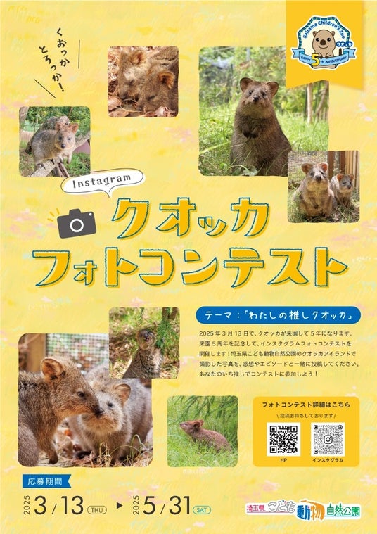 こども動物自然公園では、5月5日のこどもの日は小中学生の入園が無料になります。クオッカ来園5周年を記念して Instagramでクオッカフォトコンテストを行っていますので、是非ご参加ください。