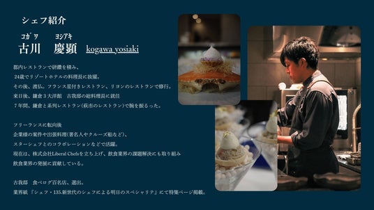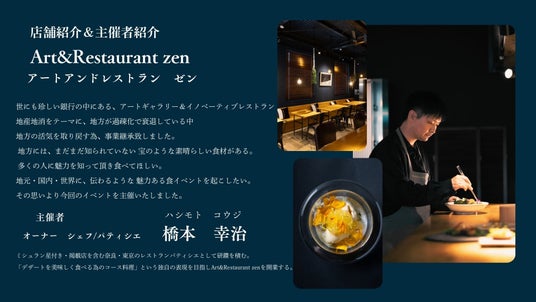 山口県長門市油谷にある「Art&Restaurant zen」は、世にも珍しい銀行の中にあるレストラン。レストランのオーナーである橋本幸治氏はミシュラン星付き・掲載店を含む奈良・東京のレストランパティシエとして研鑽を積み、「デザートを美味しく食べる為のコース料理」という独自の表現を目指し「Art&Restaurant zen」を開業。橋本氏は “地方には、まだまだ知られていない宝のような素晴らしい食材があり、多くの人にその魅力を知って頂き味わって欲しい”という思いから地元・国内・世界に、伝わるような魅力ある「食」イベントを起こしたいと、今回のイベントを主催した。このたびはゲストシェフとして、鎌倉の名店シェフである古川慶顕氏を迎え、共に腕を振るう。
