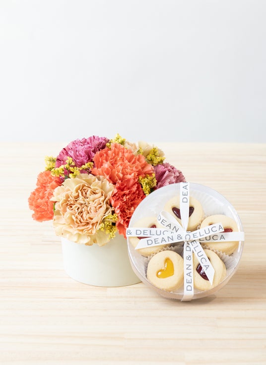 【母の日】DEAN & DELUCA ハートジャムサンドクッキーアソート10pcsとカーネーションのカップアレンジメント オレンジ