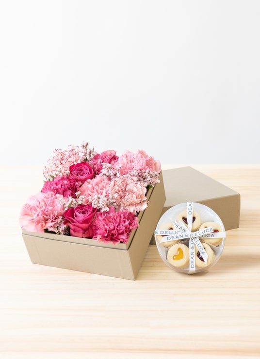 【母の日】DEAN & DELUCA ハートジャムサンドクッキーアソートとカーネーションとバラのボックスフラワー ピンク
