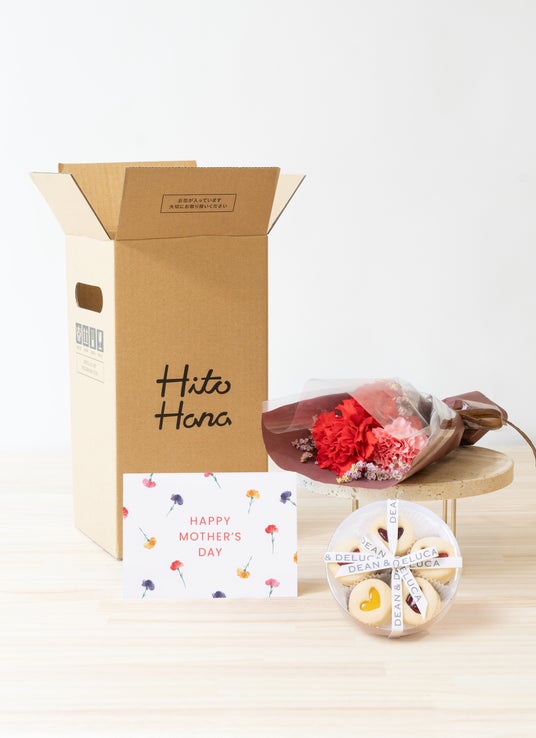 【母の日】DEAN & DELUCA ハートジャムサンドクッキーアソートとカーネーションのミニブーケ レッド 3,496円税込
