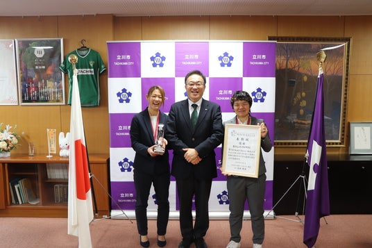 3月に開催された第7回Beach Soccer地域女子チャンピオンズカップの優勝報告のため、山田頌子選手と藤澤真凛選手が4月3日(木)に立川市長を訪問しました。