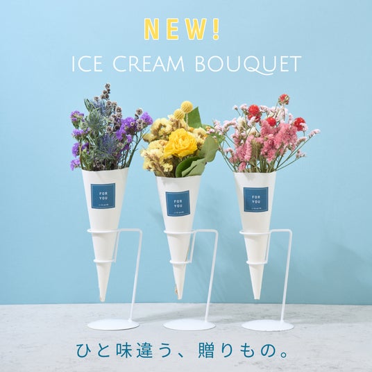 「アイスクリームブーケ」は、旬のドライフラワーをふんだんに使い、まるで本物のアイスクリームのように仕立てた、遊び心あふれる新感覚ギフトです。