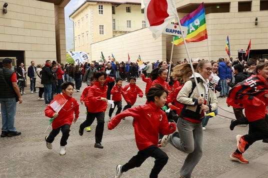 10ヶ国から3000人近くのアスリートが集まるパレードでは、大きな音楽が鳴り響く中で、「GIAPPONE(ジャッポーネ=日本)」コールを連発。体つきはまだまだ小さな子どもたちが、精一杯楽しみました。