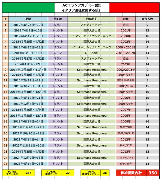 保護者やコーチなどを含めると350名超が渡伊経験済み