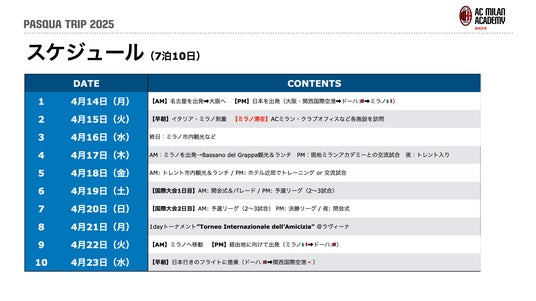 ACミランアカデミー愛知選抜チームは、U11カテゴリーでの出場。13名で5試合を闘い抜きました。2勝1敗2引き分けの勝ち点7。対戦相手はすべてイタリアのクラブでしたが、あと一歩のところで勝ち星を逃すなど「勝負の分かれ目」を異国の地で実感できたことなど、多くの収穫があった2日間でした。