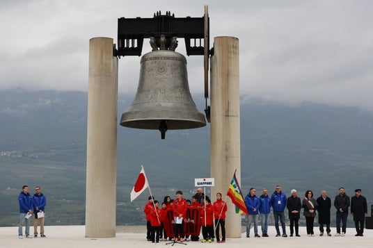 大会のオープニングセレモニーはロヴェレート市内の丘にある広場からスタート。第1次世界大戦で激戦地となったロヴェレートは、戦闘で使用された武器を溶かして、戦没者に鎮魂の祈りを捧げるための平和の鐘を建立しました。