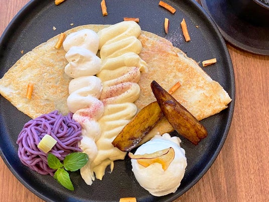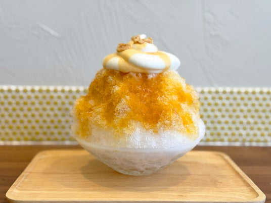 店舗で手作りした、程よくほろ苦い2種類の自家製キャラメルを使用。中には濃厚なキャラメルクリームとお芋のカスタードクリームが入っております。ゲランドの塩が良いアクセントになり、さっぱりと食べられるかき氷です。