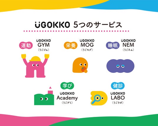 サービス概要5つのサービスをアイコン化したUGOKKOフレンズ。左上からGYM(ジム)、MOG(モグ)、NEM(ネム)、DEMY(デミー)、LABO(ラボ)