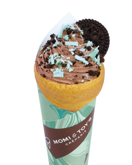 爽やかなミントホイップとチョコミントアイス、コクのある濃厚なチョコホイップをふんだんに使用した、王道の組み合わせを楽しめるチョコミントクレープです。ザクザク食感のココアビスケットをたっぷり包み込み、最後の一口まで楽しめる一品に仕上げました。