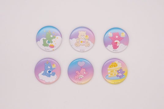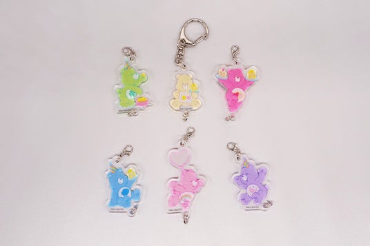 三角帽子をかぶったり、ケーキを持ってきてお祝いに駆けつけてくれたケアベアたちの連結キーホルダー。6種重ねても、推し色だけぶらさげても、ご使用いただけます。