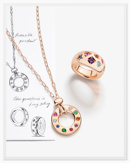 リングを引き立てているのは、洗練されたリバーシブルネックレスです。アメシスト、ルビー、エメラルド、ピンクサファイヤ、ブルーサファイヤ、ブルージルコン、オレンジサファイヤ、ツァボライトの魅惑的なパレットで飾られています。さまざまなスタイルで活躍するこの作品は、ジェムストーンがセッティングされた面とエレガントなローズゴールド面のどちらでも着用でき、長さも調整できるため、さまざまなルックを楽しめます。このようにそれぞれの特徴が「イコニカ」の洗練された特徴を保っています。