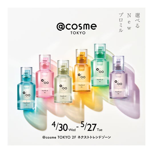 天然由来成分にこだわり、ユーザーのライフスタイルに寄り添うアイテムを幅広く展開するヘアケア&スタイリングブランド「Promille(プロミル)」は、@cosme TOKYOの "ネクストトレンドゾーン" にて期間限定のブースを展開いたします。2025年5月1日(木)から全国発売する新商品『プロミルオイルN』をいち早くチェックできる貴重な機会です。質感と香りで選べるカラフルなスタイリングオイル『プロミルオイルN』を、ぜひこの機会にお試しください。