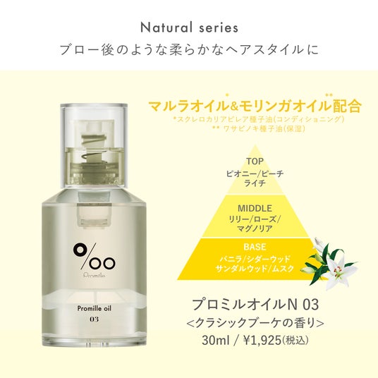 「‰=Promille」とは、ドイツ語で【1/1000】という意味。原料・香り・仕上がりの細部までこだわり、ユーザーの美しさを引き出すブランドです。全てのアイテムに天然由来成分を配合し、髪とお肌に優しく、日々のケア・スタイリングをサポートします。2019年にブランドが誕生し、2021年2月にブランドパッケージをリニューアル。現在シリーズ累計出荷本数100万本を突破し、主軸商品である『プロミルオイル』はヘア&ボディどちらにも使用できるオールインワンオイルとしてベストコスメを受賞するなど、口コミで高い評価を頂いています。