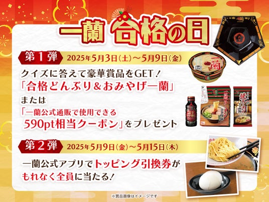 株式会社一蘭では、5月3日(土)~5月15日(木)の期間中、毎年恒例の【一蘭 合格の日イベント】を開催いたします。今年は、イベント期間を前半・後半の2部構成でお届けいたします。