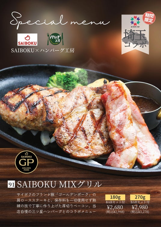 埼玉の美味を一皿に!SAIBOKUブランドの豚とハンバーグ工房自慢の三ツ星ハンバーグのコラボメニューが期間限定で販売します!!