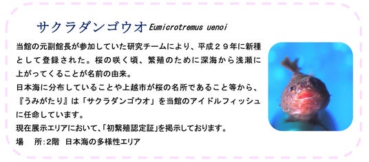 上越市立水族博物館『うみがたり』では、令和5年3月11日に館内で誕生した「サクラダンゴウオ」が(公社)日本動物園水族館協会(JAZA)の初繫殖に認定されました!