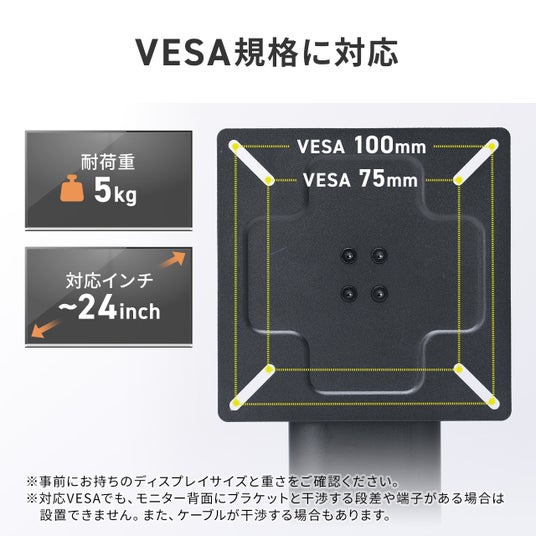 VESA規格(75×75mm、100×100mm)に準拠した液晶ディスプレイやホルダーなどの取付けが可能です。