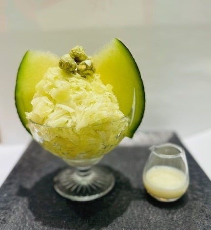 メロンの果肉をそのまま凍らせたかき氷にフレッシュなメロンのトッピングとメロン味のオリジナルポップコーンをのせました。