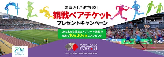 KNT-CTホールディングス株式会社(本社:東京都新宿区 社長:小山佳延)が本年9月1日に創立70周年を迎えるにあたり、グループ会社の株式会社近畿日本ツーリストブループラネット(本社:東京都江東区、社長:古川 優子)では、お客さまへ70年のご愛顧への感謝と、東京2025世界陸上公式プリンシパルサポーターとして大会の機運醸成に向けて、LINEを活用した「東京2025世界陸上 観戦ペアチケット」プレゼントキャンペーンを本日より開始いたしました。