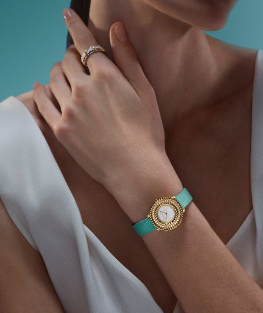 ティファニーの革新性とクラフトマンシップへの深いこだわりが強く感じられる新作「ロープ バイ ティファニー」ウォッチは、独創性と大胆さ、そしてタイムレスな美しさを融合させた比類なきデザインのレガシーを受け継いでいます。マザー オブ パールの文字盤には、ティファニー ブルー(R)のアリゲーター ストラップが、光沢あるブラックの文字盤にはブラックのアリゲーターストラップが備わります。