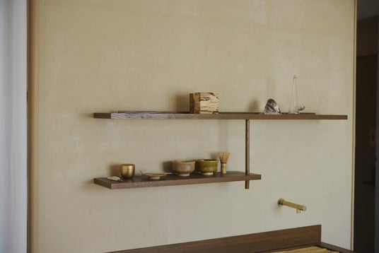 客室には、宿の名の由来にもなった“水屋”をしつらえ、大きいお部屋には湯を静かに湛える茶釜を、小さいお部屋には手のひらに寄り添う鉄瓶をご用意いたしました。陶芸家の片川祐之介氏の茶器で、京都の茶園で摘まれた香り高いお茶をお楽しみいただけます。また、水屋の壁には黒谷和紙職人・アーティストのハタノワタル氏率いる紙漉キハタノの手漉き和紙をあしらいました。