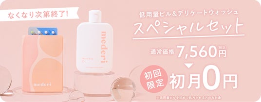 mederi Pill「低用量ピル」の新規ご利用者様のみ限定で、デリケートウォッシュ現品をつけたスペシャルセットを【通常価格7,560円(税込)】から初回限定特別価格として、【初月0円】にてご提供します。
