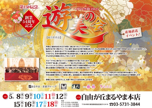 まるやま・京彩グループは、創業54周年を記念して、第15回目となる「遊美の会【展示即売会】」を2025年5月8日(木)~12日(月)、5月15日(木)~18日(日)の期間、自由が丘まるやま本店にて開催いたします。