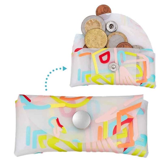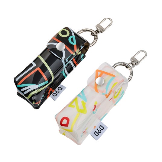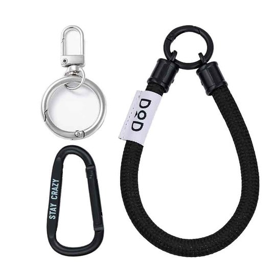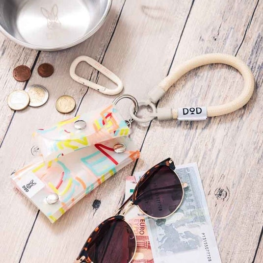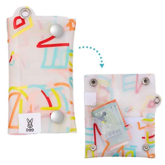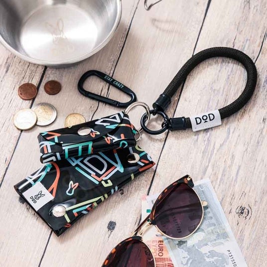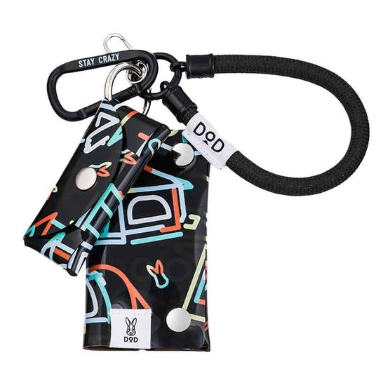 DODのテントとブランドロゴのウサギをモチーフにしたオリジナル総柄のPVCウォレット&コインケースに、カラビナ、ホルダーリング、ストラップを加えた豪華5点セット。
