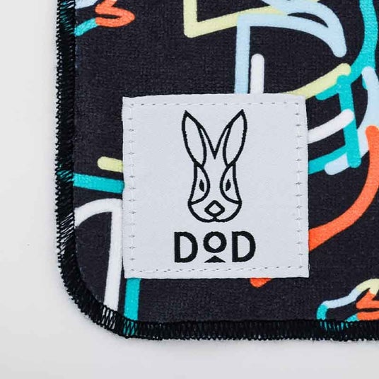 DODのテントとブランドロゴのウサギをモチーフにしたオリジナル総柄をブラック&ホワイトのタオルセットに。