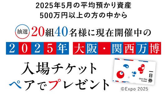 さらに、2025年5月の平均預かり資産500万円以上の方の中から抽選で20組40名様に、現在開催中の「大阪・関西万博入場チケット」をペアでプレゼントいたします。