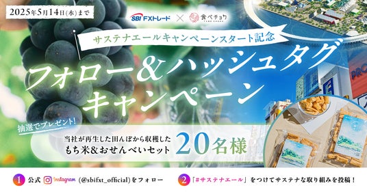 当社ではこれを記念して、2025年5月より月替わりで各都道府県・地域ごとにフォーカスして各地域の生産者を応援する「SBI FXトレード×食べチョク サステナエールキャンペーン」へリニューアルすることといたしました。さらに、Instagramにてどなたでも参加いただける「サステナエールキャンペーンスタート記念!フォロー&ハッシュタグキャンペーン」も開催いたします。